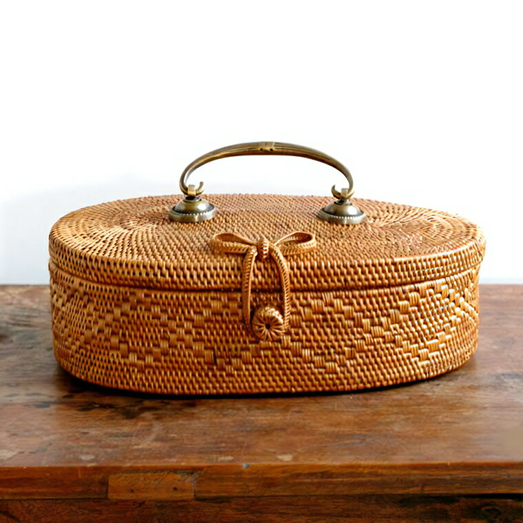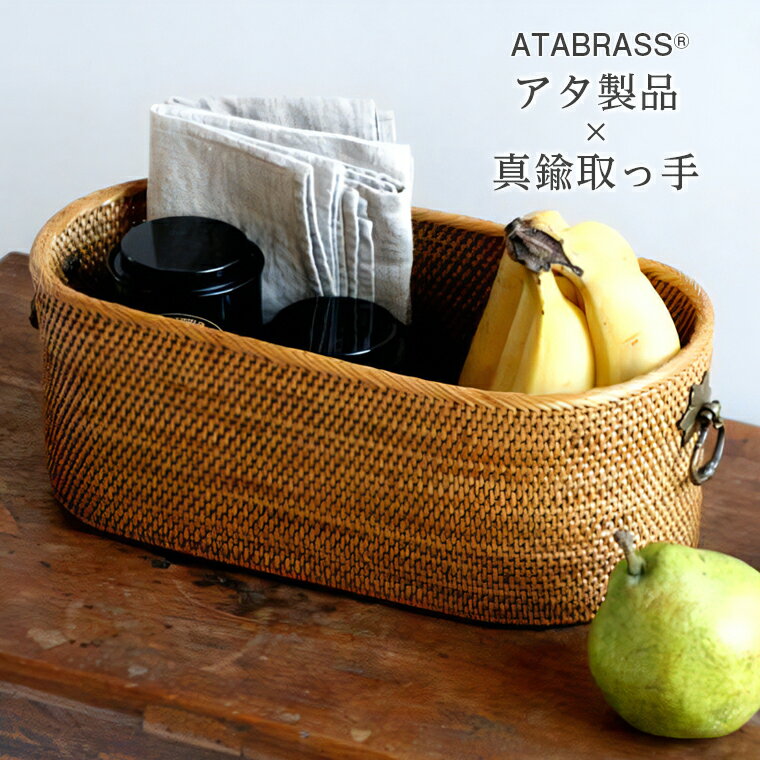 【ふるさと納税】アタ製品 真鍮取っ手リボン楕円バスケット(幅25cm) 雑貨 小物入れ 収納 バスケット 楕円 取っ手 インテリア グッズ オリジナル 数量限定 贈り物 プレゼント ギフト 手作り バリ島雑貨 アジア雑貨 千葉県 富津市 送料無料