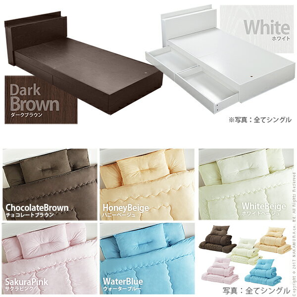 ●安心のメーカー2年保証(ベッドのみ)【セット構成】ベッドx1掛布団x1敷布団x1まくらx1【カラーバリエーション】[ベッド]ダークブラウン・ホワイト[布団]チョコレートブラウン・ハニーベージュ・ホワイトベージュ・サクラピンク・ウォーターブルー【仕様】[ベッド]本体:プリント紙化粧パーチクルボードコンセント:2口(1500W)収納:引出しx2◎組立品[布団]側地:ポリエステル100%(ピーチスキン加工)中綿:ポリエステル100%(中空綿)【サイズ】[ベッド]幅141.5x奥行218.5x高さ69.5(床板高さ26)cm重量:約82kg[敷布団]約140x210cm重量:約4kg/中綿:約3.5kg[掛布団]約190x210cm重量:約2.5kg/中綿:約1.7kg[まくら]約63x43cm重量:約500kg/中綿:約400g株式会社ナカムラ(OI-3500601)