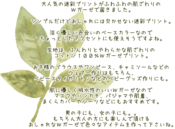 『Mild Camouflage≪マイルドカモフラージュ≫』コットン100%Wガーゼ素材:コットン100% 生地幅:約108cm